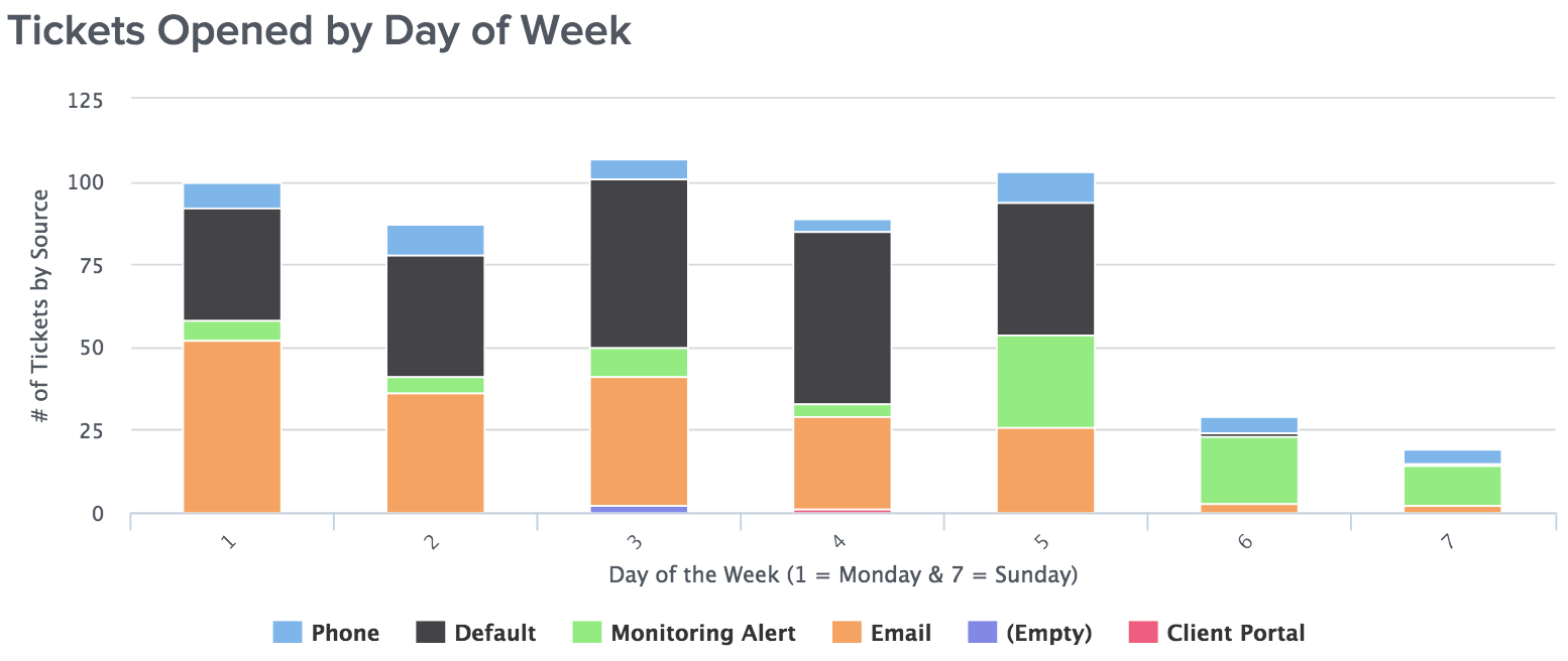 With a quick glance you can see the trend of tickets being created on a daily basis.  Although Mondays may seem like the busiest day, you can see from the gauge above that Wednesday is the peak day and Friday also happens to be a high volume day.  By adding the additional dimension of the Ticket Source to this gauge you can get much more visibility into where the tickets are coming from each day.