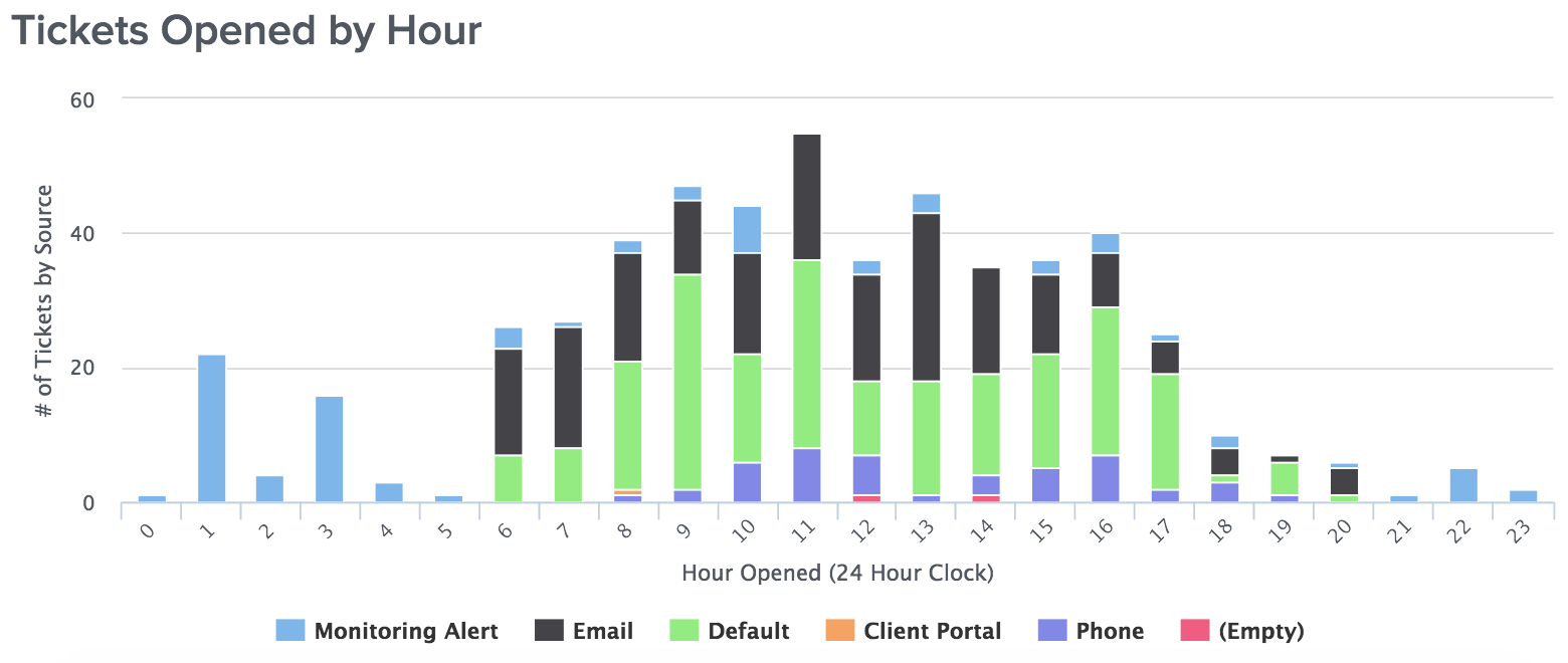The natural next question after being able to see the tickets per day is when are they coming in throughout the day?”  From the example above you can see that there tends to be a gradual increase in the morning until the main peak just before lunch.  For the remainder of the day it bounces up and down until a significant drop in volume after hours.  Having this information, you are able to properly staff your response team for those peak hours.  For example, during the 11am (pre-lunch) rush it might be best to have an extra resource or two log into the ticketing system and help the volume.