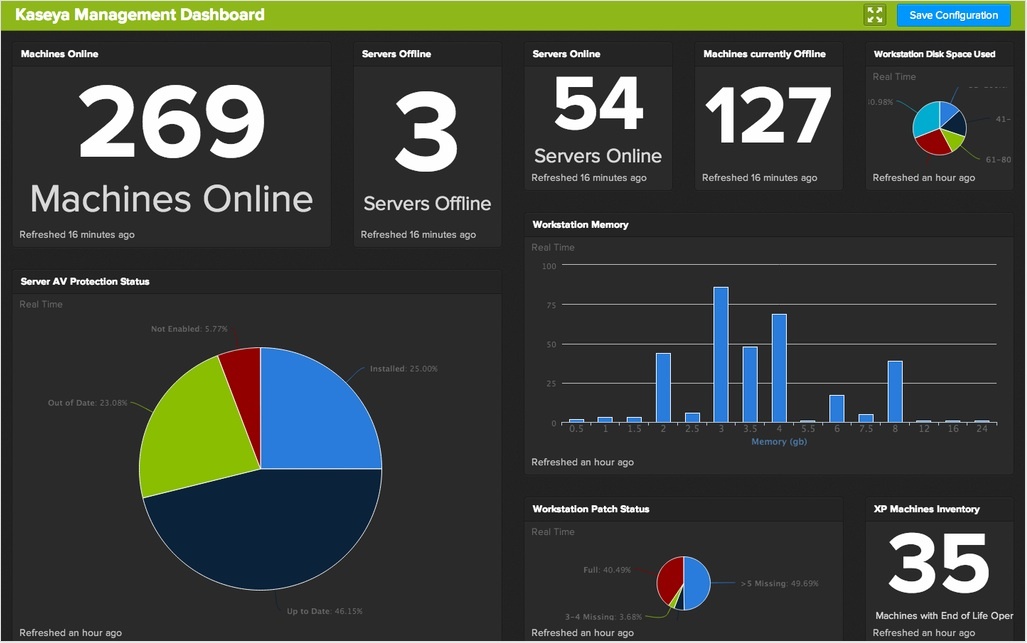 • Dashboard and Reporting is a top priority. One of the largest and best attended breakout session was on Dashboard and Reporting. Most participants are asking for more access and customization capabilities with their data. Currently, many companies utilize a third party tool, like BrightGauge's technology, to streamline and manage their reporting. We left with some great ideas for our new Kaseya Management Dashboards (see the image below), which we have already made available to our partners.