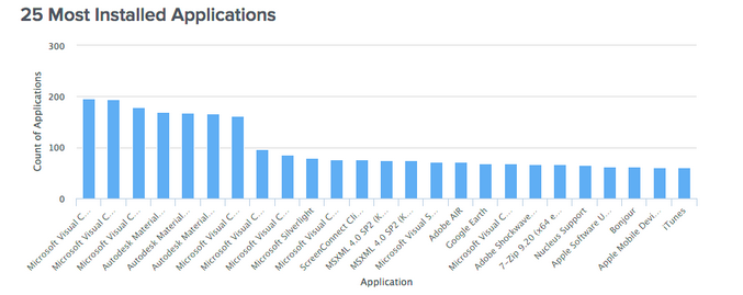 Top 25 Most Installed Applications - Standardization of the applications on your client’s network should be a top priority and more importantly, being specific on the types of applications you do not support. This gauge provides an easy visual to start the conversation about the applications running on the network.