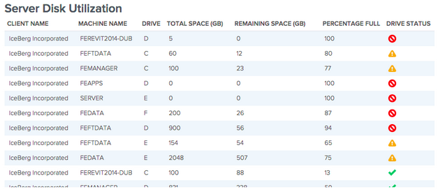 Server Disk Utilization - Understanding the space available on your client’s critical servers is important to ensure that all the servers are running properly. A key disk drive that gets full can bring down the server so keeping your clients updated on the trend is critical.