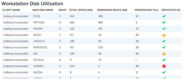 Workstation Disk Utilization - Space on a workstation is not as critical as servers but it does provide early indications on which workstations may need to be upgraded. This helps to avoid end user downtime and is also a potential upselling opportunity.