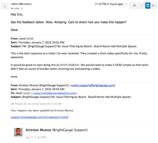 Kristian joined our growing crew. As the main Support guru on our team, we left Kristian with the responsibility of making sure our support time continued to be world-class and that our customers were happy with the help we provide. We didn’t really set many guidelines about how he should achieve that task… this was his project to own. Kristian was up and running in no time, and hearing him recording quick videos became a common practice. As the months flew by and the videos kept multiplying, the happy customer responses just kept rolling in. In fact, we have a Slack channel dedicated to sharing Customer Feedback, and after a while we knew we had definitely written a new chapter in the BrightGauge history book.